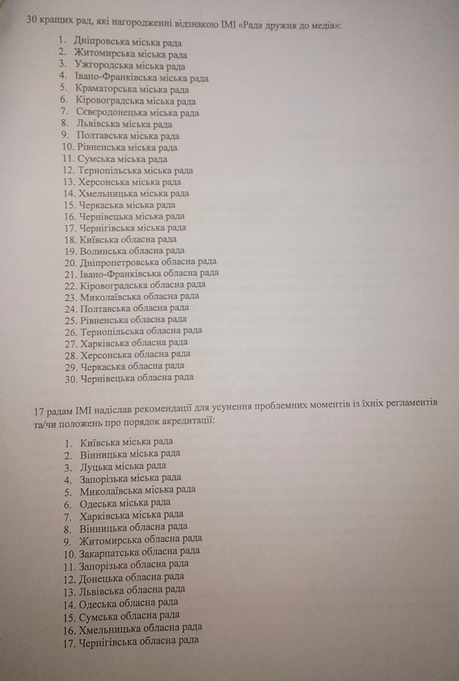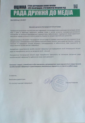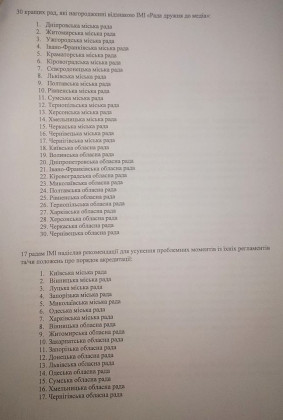 Натомість відзначили, що були приємно вражені, бо багато рад врахували всі вимоги Закону України «Про інформацію» під час створення своїх регламентів. Ужгородська міська рада – серед кращих рад, яких нагородили відзнакою ІМІ «Рада дружня до медіа».