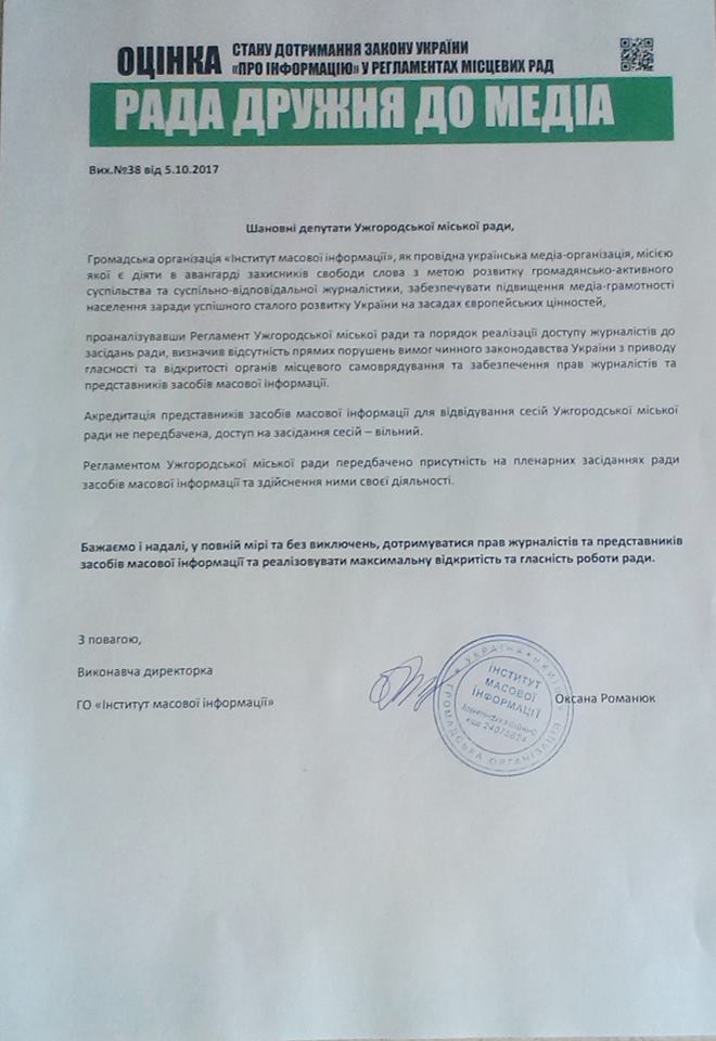 Як зазначається, ІМІ «проаналізувавши Регламент Ужгородської міської ради та порядок реалізації доступу журналістів до засідань ради, визначив відсутність прямих порушень вимог чинного законодавства України з приводу гласності та відкритості органів місцевого самоврядування та забезпечення прав журналістів і представників ЗМІ. Акредитація представників засобів масової інформації для відвідування сесій Ужгородської міської ради не передбачена, доступ на засідання сесій – вільний.Регламентом Ужгородської міської ради передбачено присутність на пленарних засіданнях ради засобів масової інформації та здійснення ними своєї діяльності».