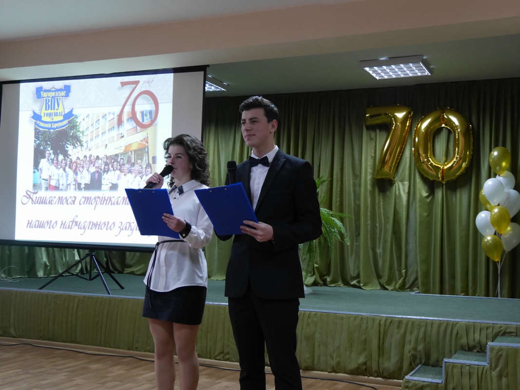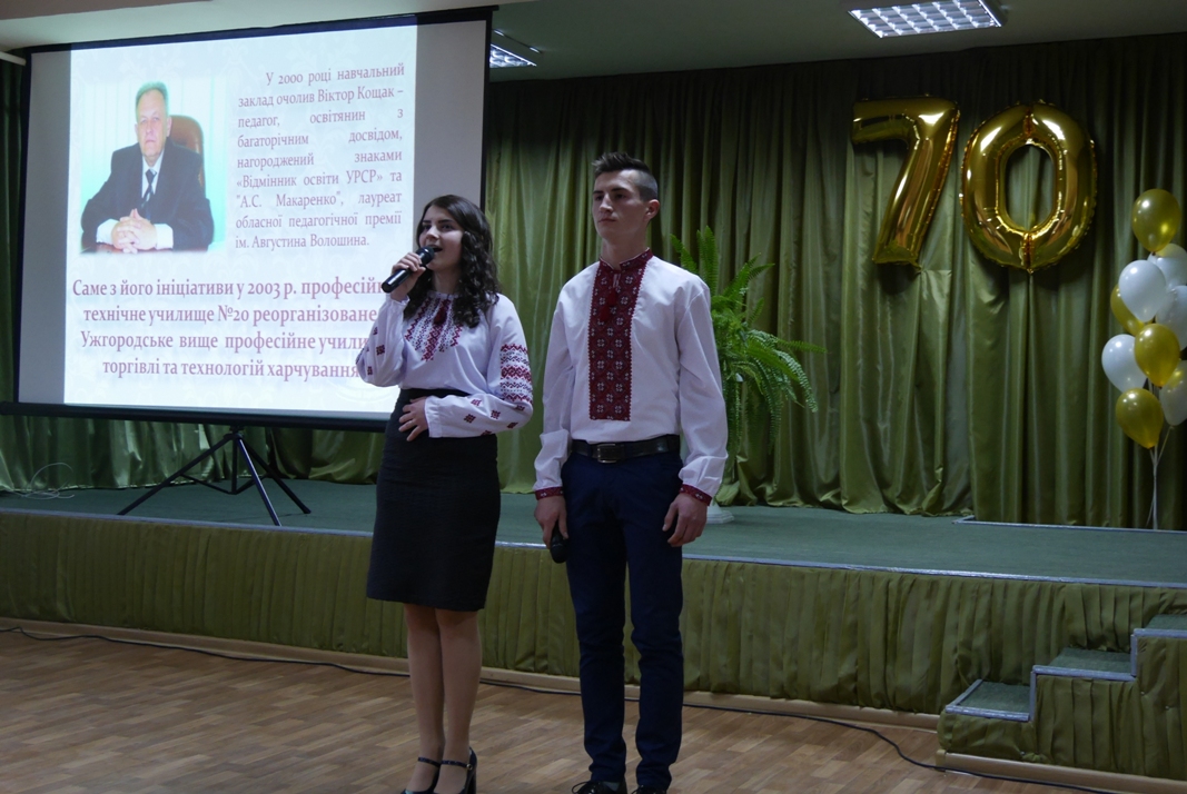 70-літній ювілей відзначило сьогодні Ужгородське вище професійне училище торгівлі та технологій харчування. На свято завітали представники обласної та міської ради, ветерани праці закладу, директори професійно-технічних училищ краю, роботодавці, колишні випускники, зокрема, відомий далеко за межами Ужгорода, Закарпаття та навіть України кондитер Валентин Штефаньо, теперішні учні. Вітали ювілярів заступник голови Закарпатської обласної ради Петро Грицик, керуючий справами виконкому Ужгородської міської ради Олена Макара, директор департаменту освіти і науки Закарпатської ОДА Ганна Сопкова, заступник начальника управління освіти Ужгородської міської ради Марина Пуківська, інші поважні гості. Для усіх присутніх чудову концертну програму підготували учні закладу.