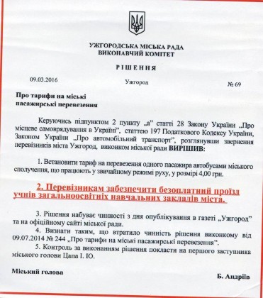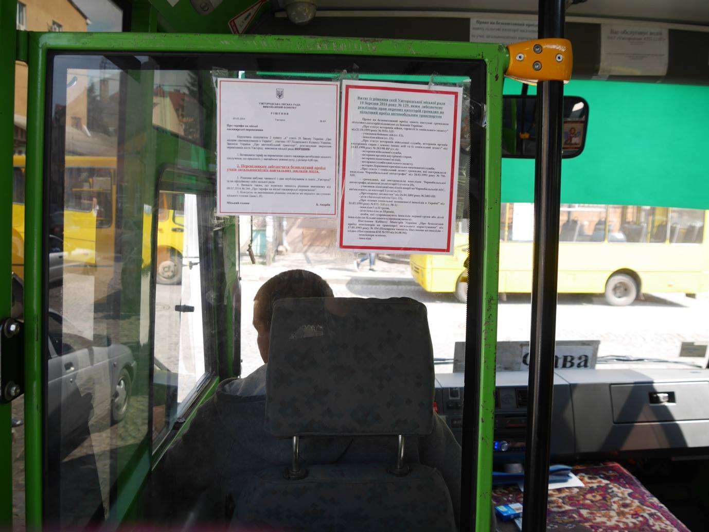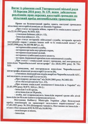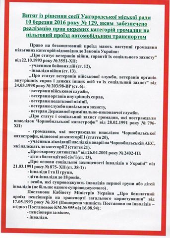 Текст рішення виконкому міської ради Ужгорода про тарифи на міські перевезення, де особливо виділено про безоплатний проїзд для учнів загальноосвітніх шкіл міста, а також перелік категорій громадян, які мають право на пільгові перевезення розмістять в усіх автобусах на міських маршрутах Ужгорода.
