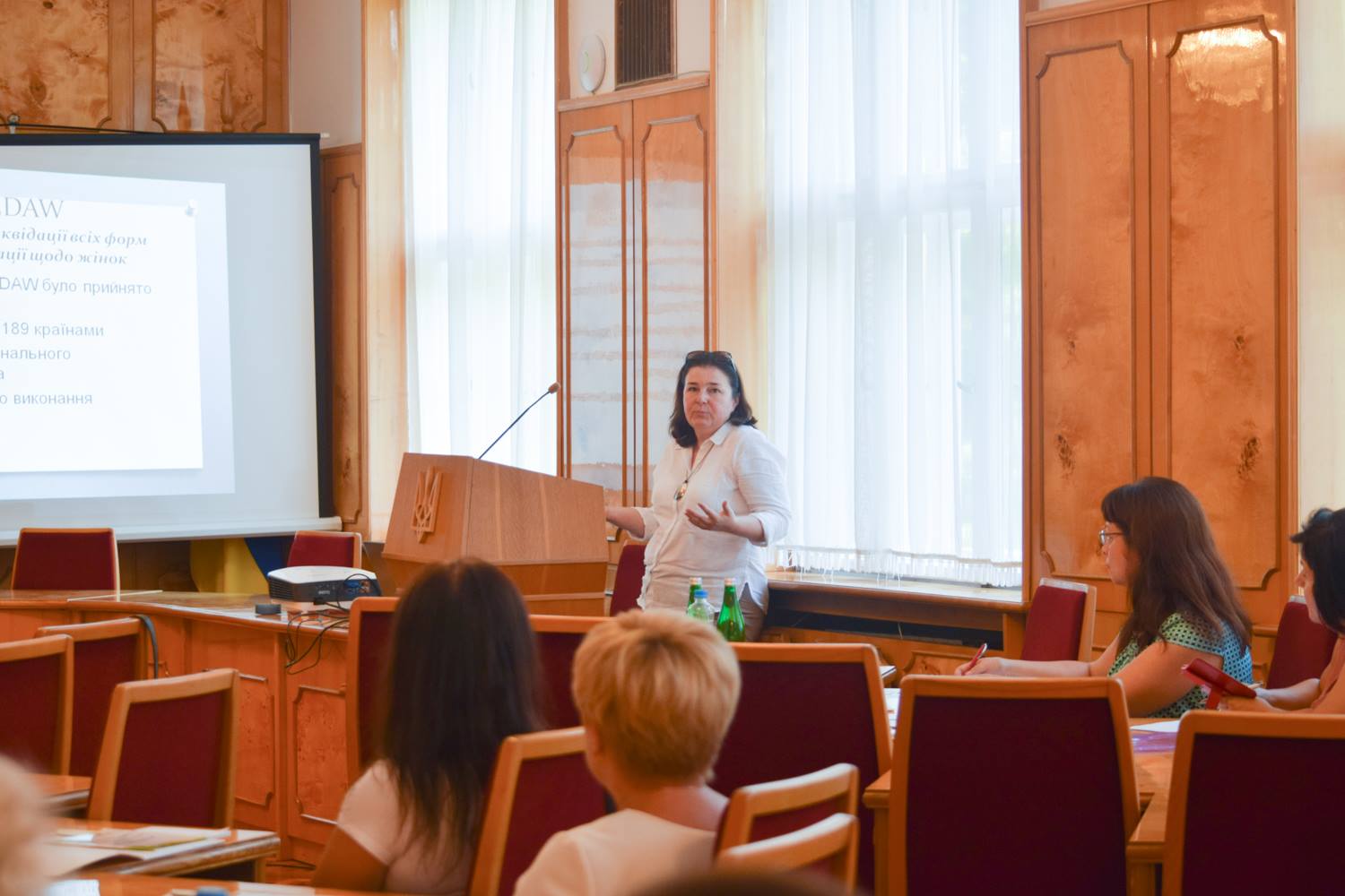 Координатор проекту Марта Чумало розповіла присутнім про рекомендації CEDAW щодо виконання Україною Конвенції «Про ліквідацію всіх форм дискримінації щодо жінок», резолюції Ради Безпеки ООН 1325 «Жінки, мир, безпека», а також Державної соціальної програми забезпечення рівних прав та можливостей жінок і чоловіків на період до 2021 року, прийнятої Кабінетом Міністрів України 11 квітня 2018 року.