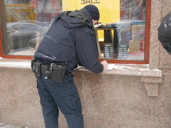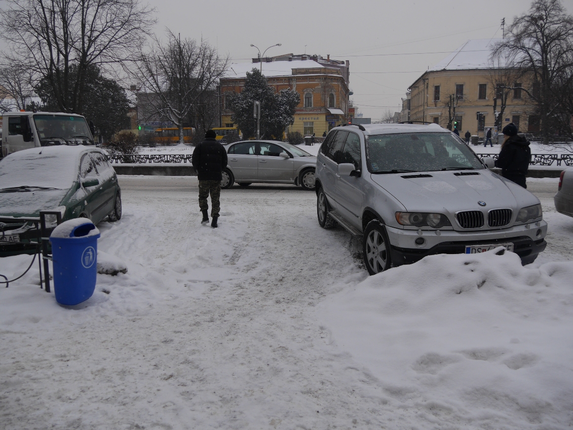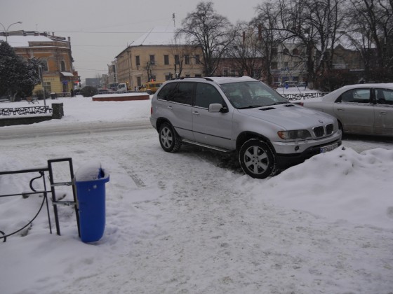 Ще не завершили оформлення постанови про порушення на цього водія, як поруч із ним уже припаркувалася ще одна машина. Пішоходи мусили маневрувати між авто, які густо стоять тут уздовж всієї площі. Водій іншого авто – «BMW», так само поставив машину з іншого боку площі – на пішохідному переході біля «УкрЕксімбанку».