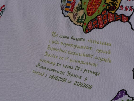 Згодом карта побувала у кожному регіоні України, де працівники казначейської служби заповнювали її місцевими орнаментами та символами міст. Вишили на карті й герб України, а також символ миру — голуба. Презентували вже завершену роботу 19 жовтня минулого року в Києві. Зараз карта знову вирушила у “всеукраїнське турне”, аби стати символом згуртованості та єдності.