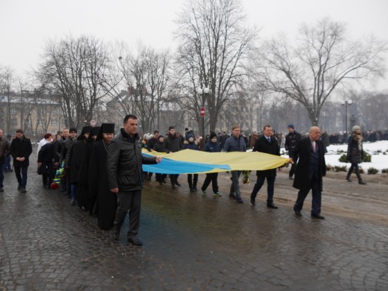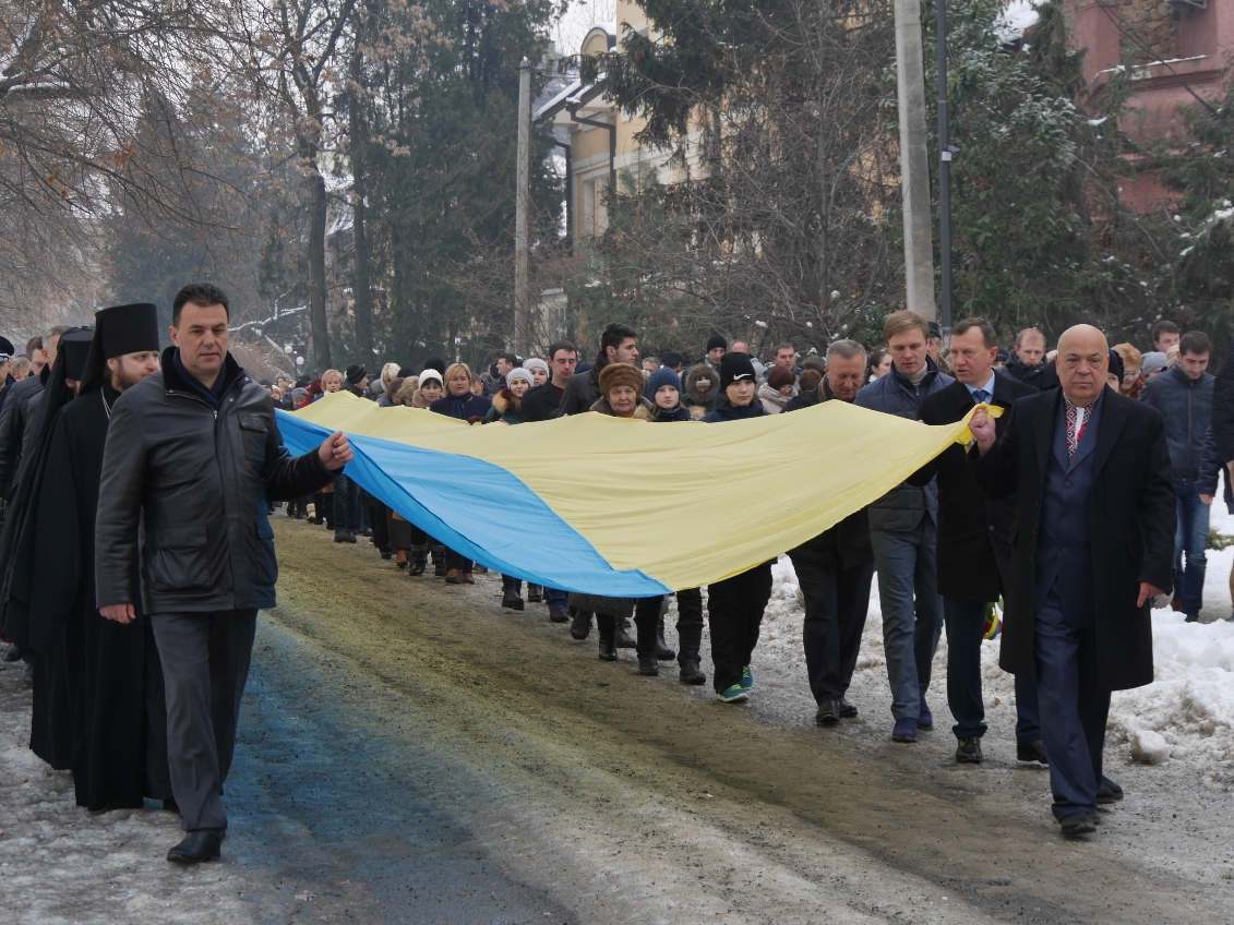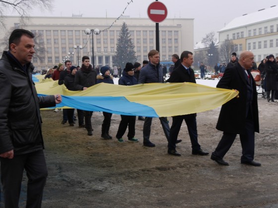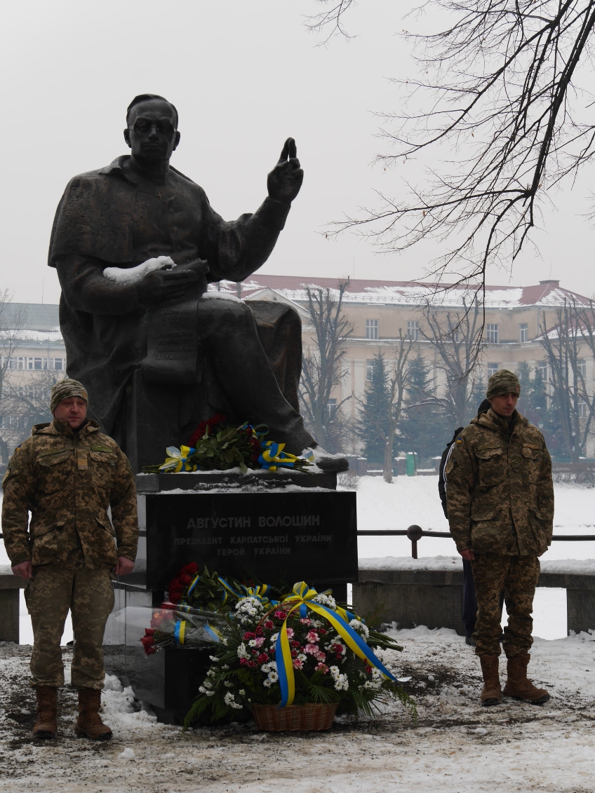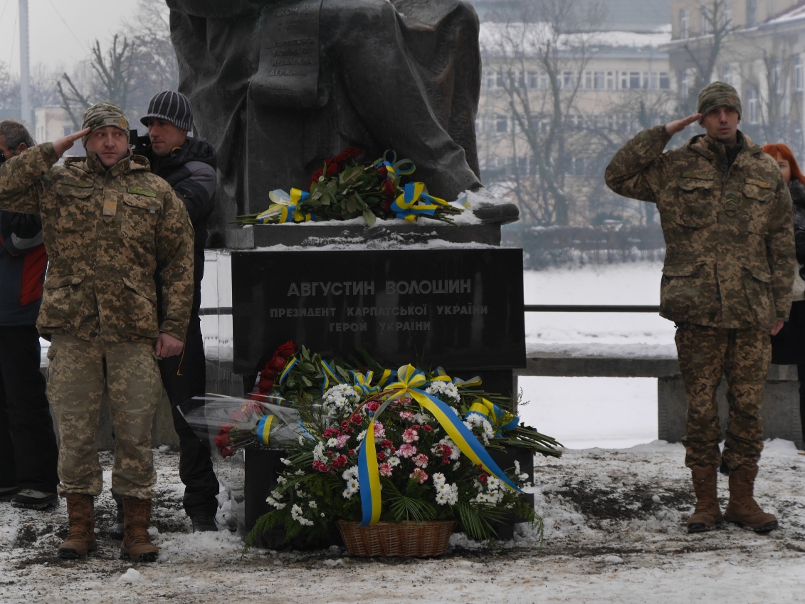 Керівництво області та міста очолило колону ужгородців, які пронесли з площі Народної до пам’ятника Президенту Карпатської України Августину Волошину на набережній Незалежності 100-метровий прапор України. До цього монумента теж поклали квіти.