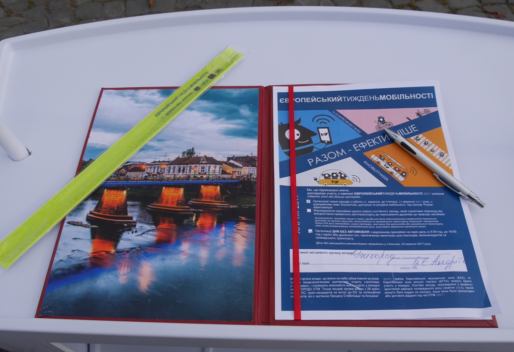 Ужгород долучився не лише на рівні громадських організацій та громадських представників – міський голова Богдан Андріїв підписав Хартію Європейського тижня мобільності, задекларувавши цим самим, що міська влада підтримує організацію тижня заходів з суботи,16 вересня, до п’ятниці, 22 вересня 2017 року, з урахуванням теми “Екологічна, доступна та розумна мобільність” під гаслом «Разом- ефективніше», готова впроваджувати принаймні один новий постійний захід, який сприятиме переходу від використання приватного автотранспорту до пересування дружніми до природи засобами, організувати День без автомобіля. Після цього від пам‘ятника Духновичу відбувся велозаїзд містом від UBC «Ужгородської велосипедної культури».