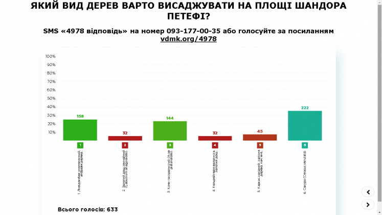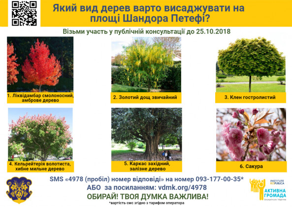Ужгородська міська рада цікавиться думкою ужгородців, які дерева садити на пішохідній оновленій частині площі Шандора Петефі. Оскільки надходило багато різних пропозицій, вирішили скористатися методом консультацій за допомогою сервісу “Ваша думка”.