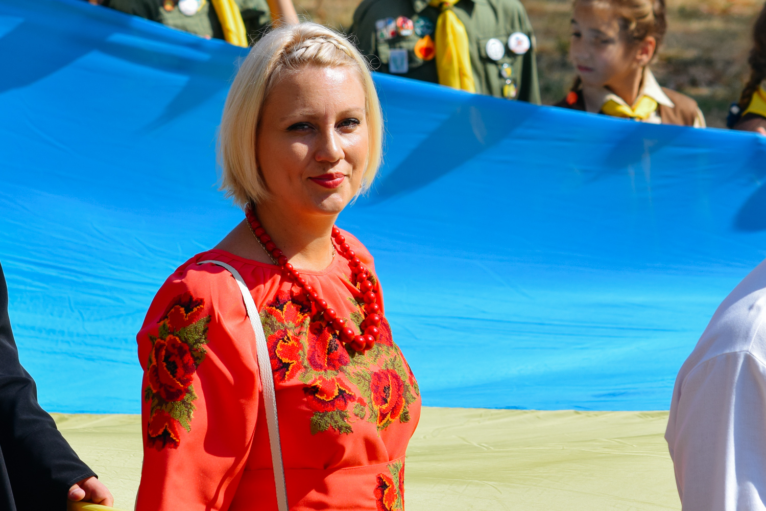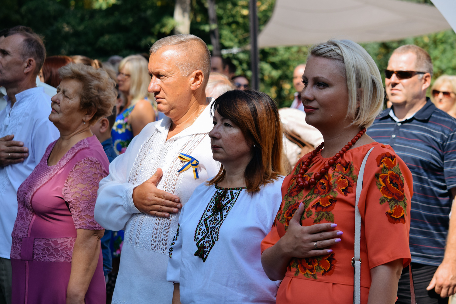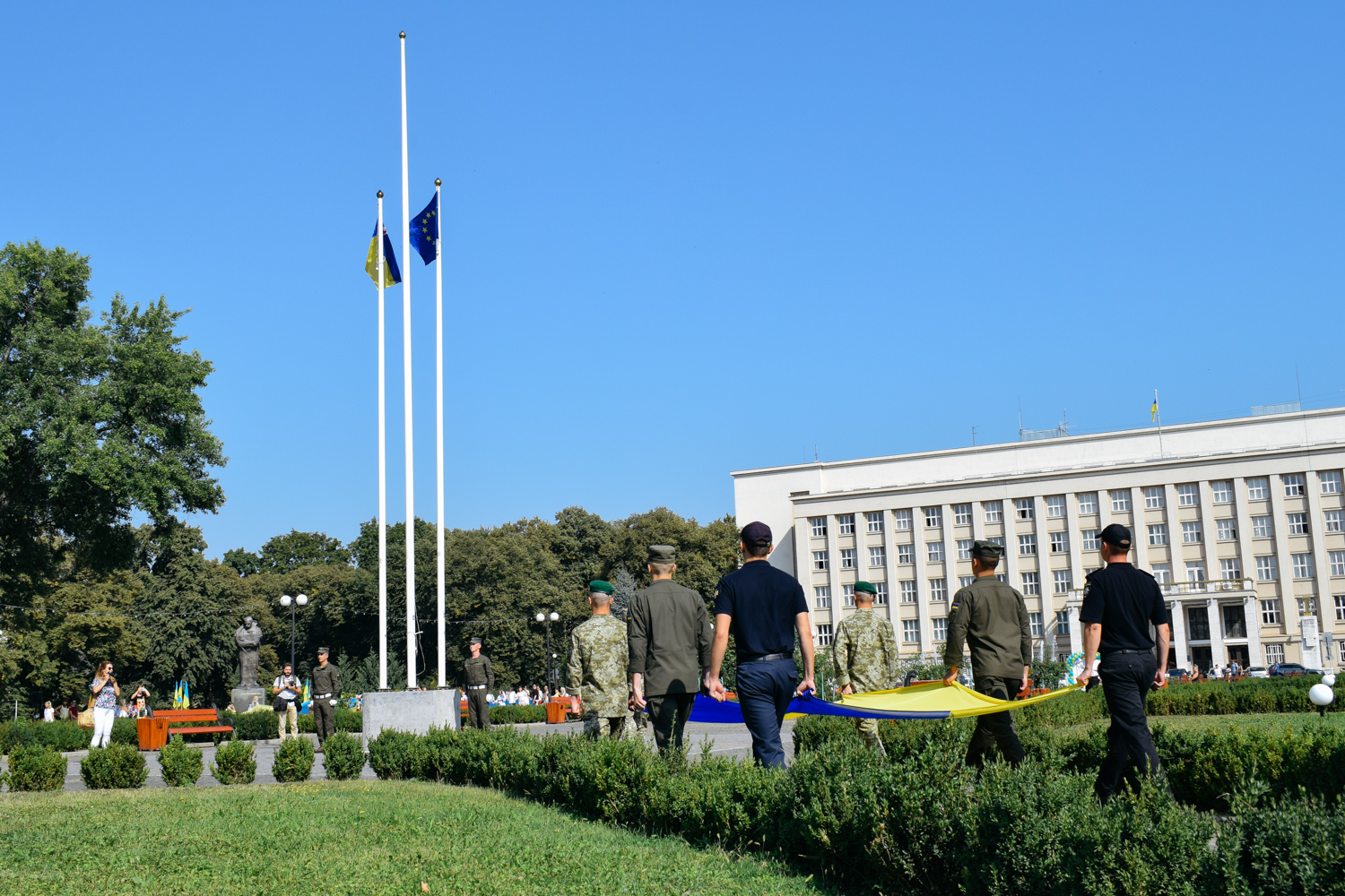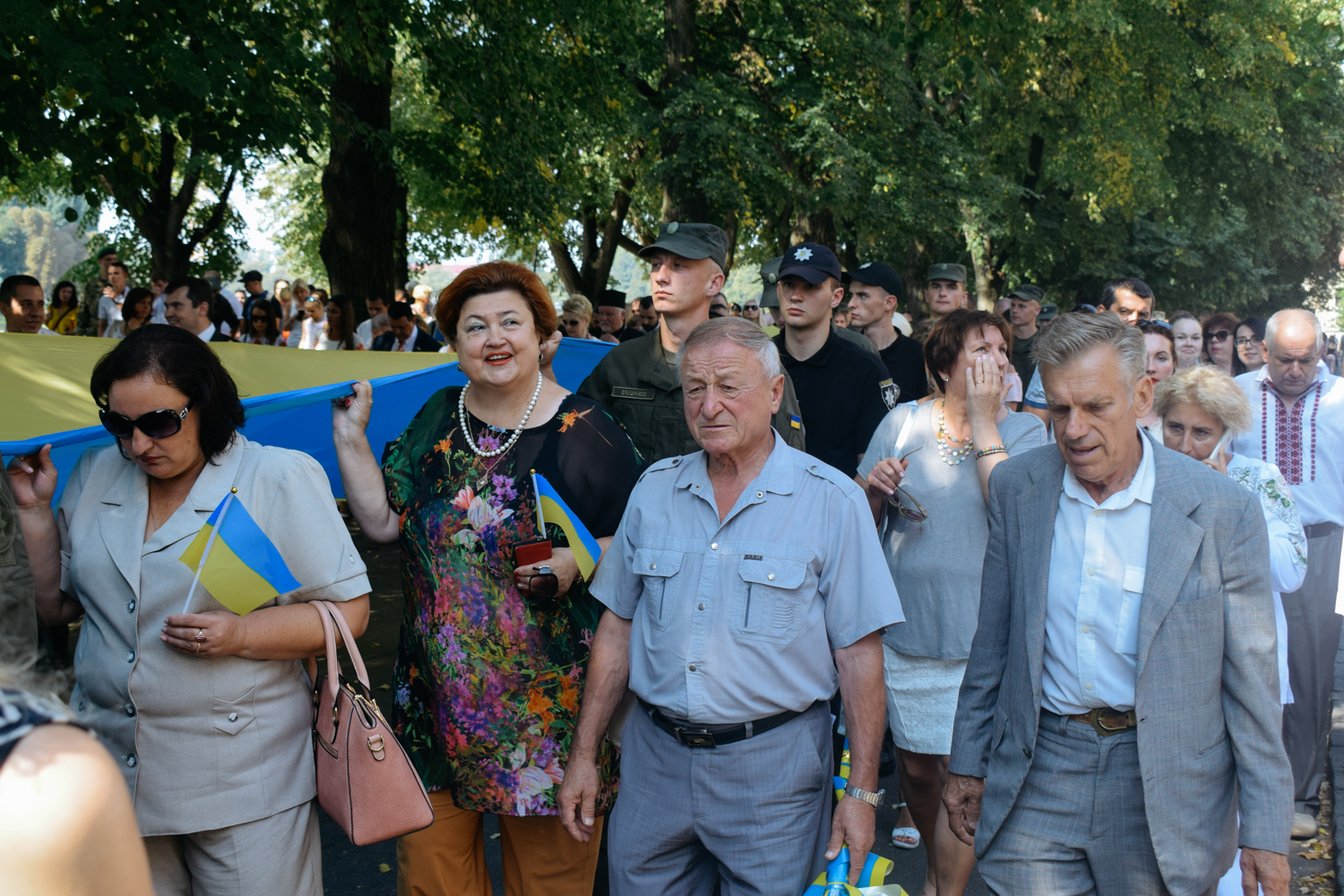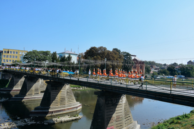 Далі святкова хода зі 100-метровим Державним прапором, на чолі якої марширував ансамбль барабанщиць Ужгородського коледжу культури і мистецтв, рушила набережною Незалежності до пам’ятника президенту Карпатської України Августину Волошину, де також відбулося покладання квітів. Оркестр головного управління Національної поліції України виконав Державний гімн України, після чого хода рушила через пішохідний міст до облмуздрамтеатру, з’єднавши два береги Ужа 100-метровим стягом.