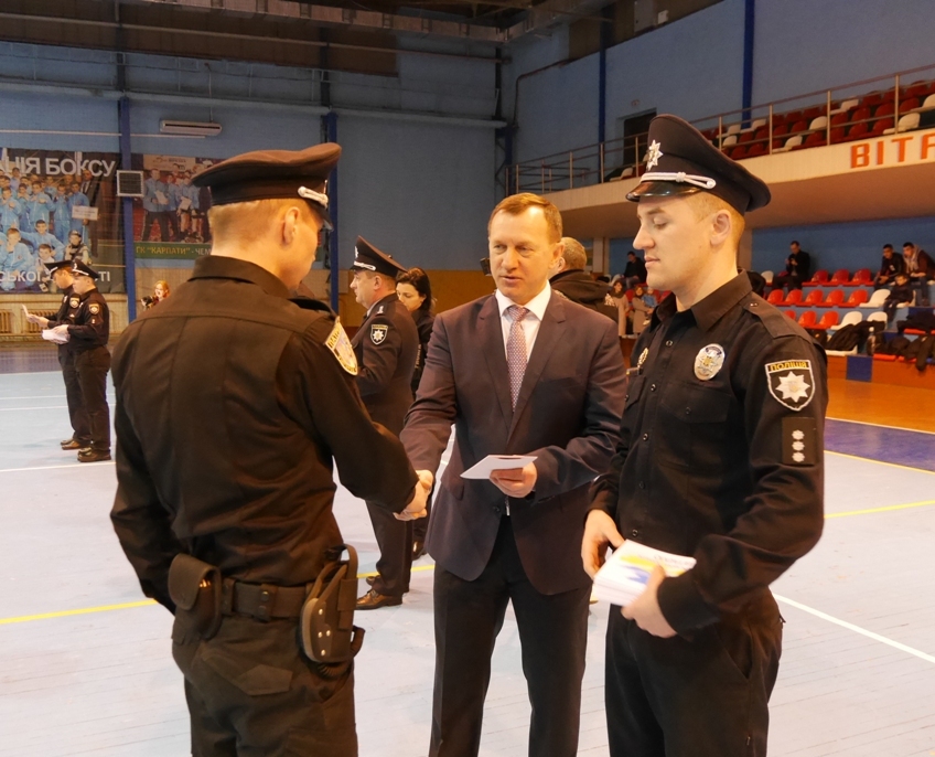 Привітали новобранців заступник начальника ГУНП в Закарпатській області Іван Пеняк та міський голова Ужгорода Богдан Андріїв. «На вас покладено велику відповідальність – підтримувати порядок, охороняти й захищати життя людей, забезпечувати спокій і дотримання Закону у нашому місті, області. Бажаю, щоб вам усе це вдавалося, щоб із покладеними на вас обов’язками легко справлялися», – звернувся до патрульних Богдан Андріїв. Побажав наснаги, гідно служити у правоохоронних органах Закарпаття Іван Пеняк.
