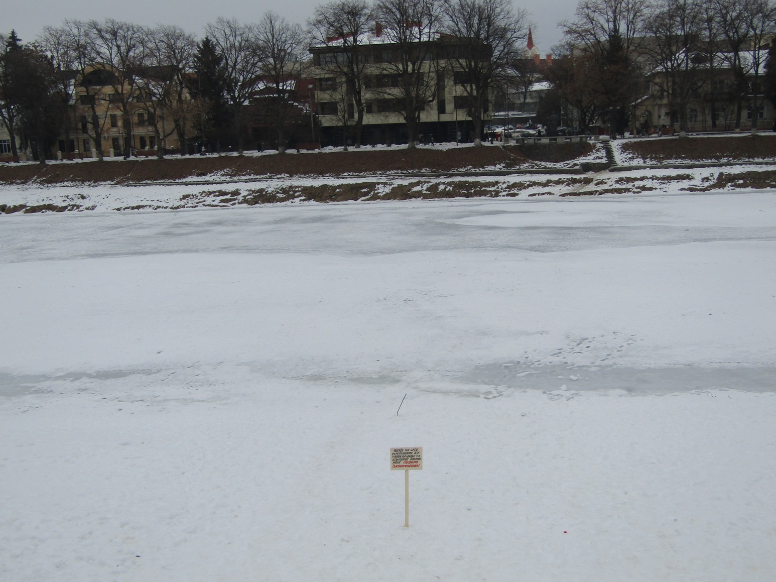 Сьогодні в Ужгороді біля водойм повторно встановили попереджувальні таблички, які забороняють вихід на лід, пересування та катання на льоду, підлідний вилов риби.