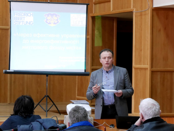 Голова правління Центру досліджень місцевого самоврядування Володимир Бригілевич розповів про діяльність Центру та Представництва Фонду ім.Фрідріха Еберта в Україні, а відтак перейшов до роз’яснення організації ефективного управління житловим будинком, аналізу способів управління і методів впровадження енергоефективних заходів в житловому секторі та детально описав роль у цих процесах голови правління ОСББ та управителя.