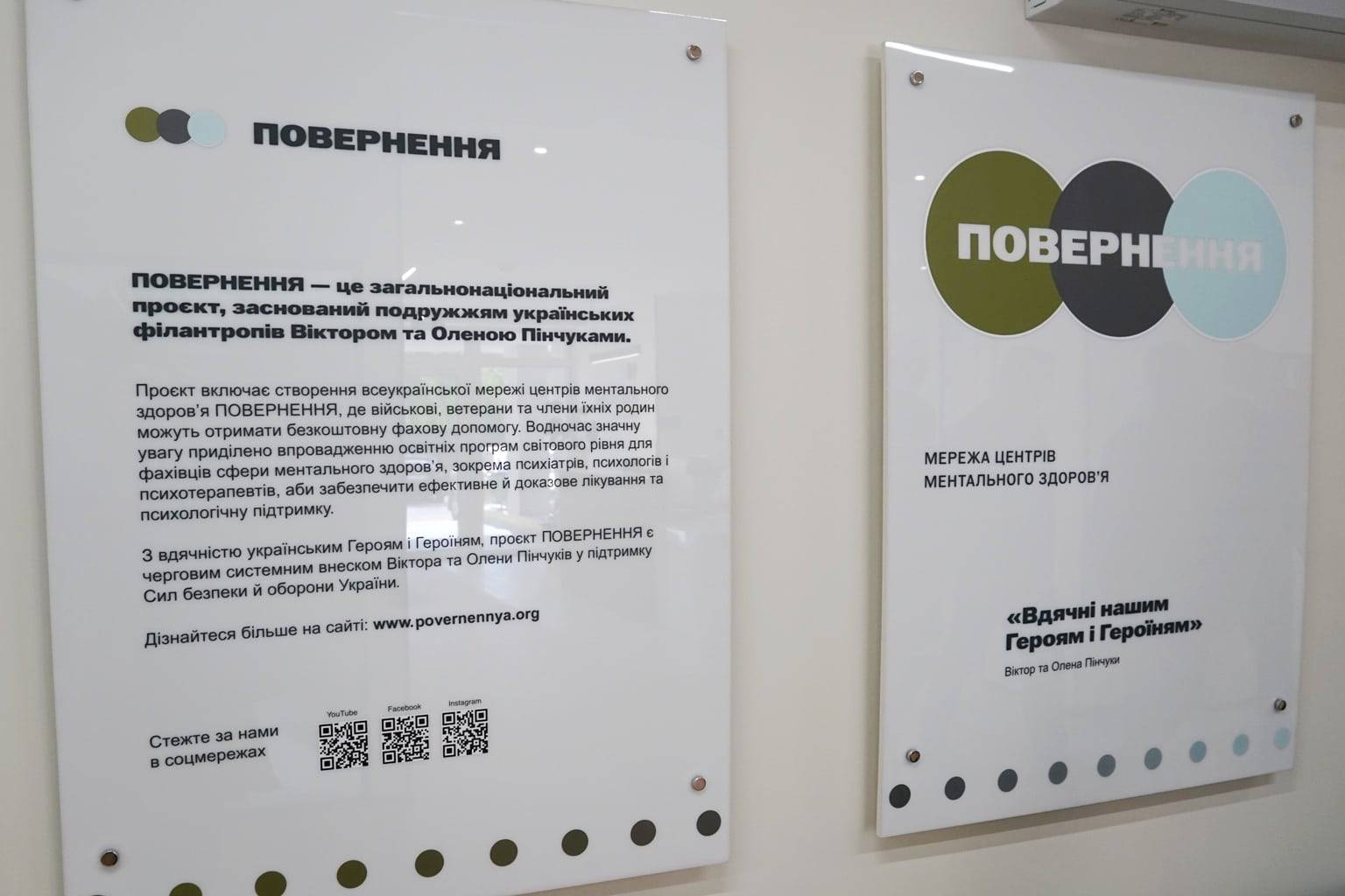 Проєкт «ПОВЕРНЕННЯ», заснований Віктором та Оленою Пінчуками, спрямований на підтримку ментального здоров’я захисників і захисниць України, які зазнали психологічних наслідків війни, а також їхніх близьких. Ініціатива є прикладом ефективної взаємодії держави та приватного сектору: благодійники створюють сучасні, комфортні й безбар’єрні простори на базі державних медичних установ.