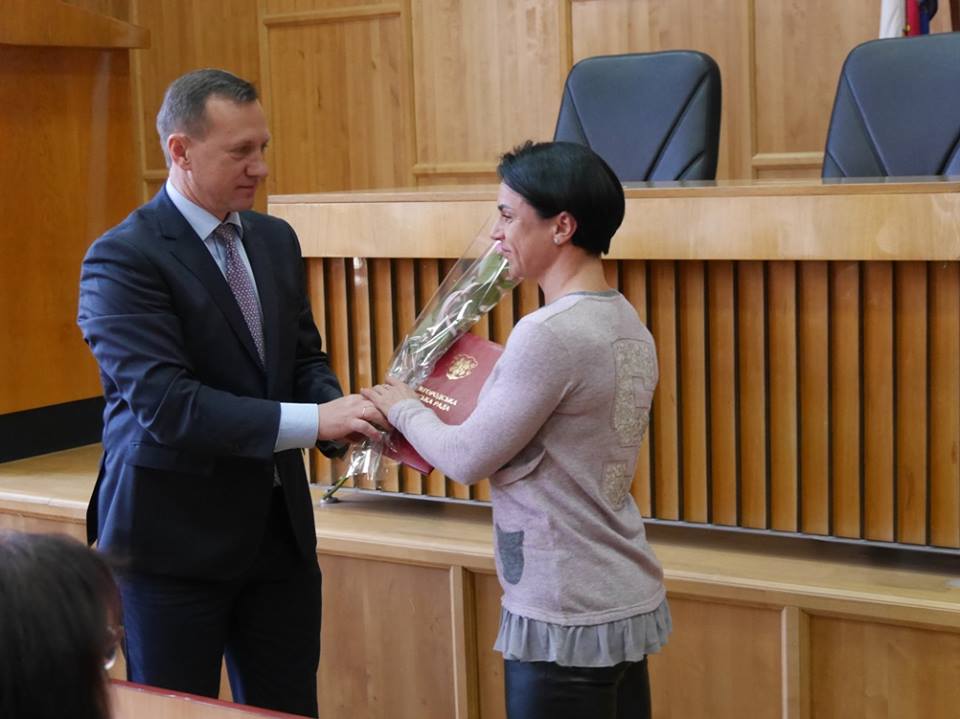 Сьогодні відбулося друге пленарне засідання чергової сесії Ужгородської міської ради. Перед його початком міський голова Богдан Андріїв привітав та нагородив грамотою Ужгородської міськради Юлію Гомбош, яка стала абсолютною чемпіонкою України з бодіфітнесу. Нещодавно Чемпіонат України з бодібілдингу та фітнесу проходив у Вінниці, за звання переможців у кількох номінаціях змагалися жінки та чоловіки, понад вісім десятків учасників із 12 областей України. За оцінками журі, ужгородка Юлія Гомбош стала кращою спочатку у своїй категорії (зі зростом до 163 см), а відтак виборола титул абсолютної чемпіонки України у категорії «бодіфітнес». До речі, пані Юлія – багатодітна мама, виховує трьох дітей, а також є талановитим кондитером.