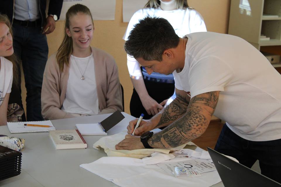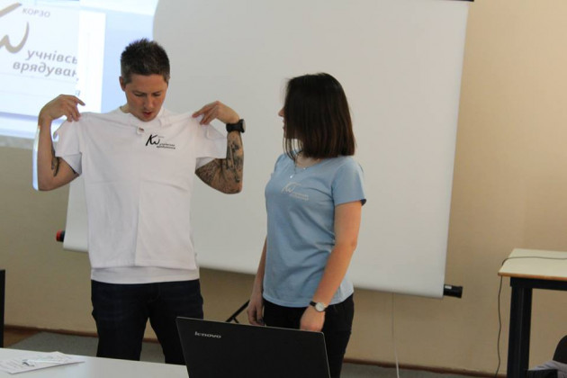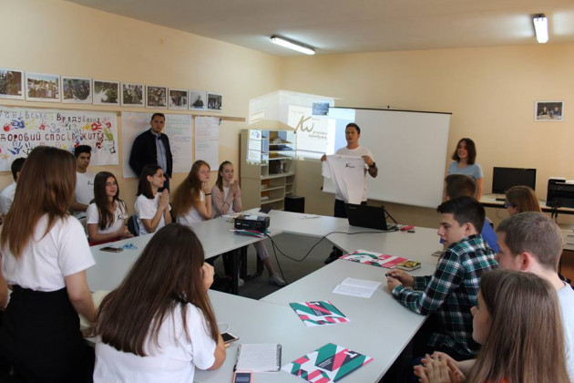 Також на згадку про Медіа-центр голова учнівського врядування міста, учениця УЗОШ №6 Наталія Савко подарувала Олександру Педану фірмову футболку з логотипом учнівського врядування міста Ужгорода. А голова комітету міжнародних відносин, учениця НВК «Гармонія» Антоніна Тегза розповіла про реалізацію екологічного проекту «Дитинство без сміття», у рамках якого планується пошиття екоторб. Для того, щоби заохочувати дітей міста до збереження навколишнього середовища, учениця попросила поставити автограф на одній із таких сумок.