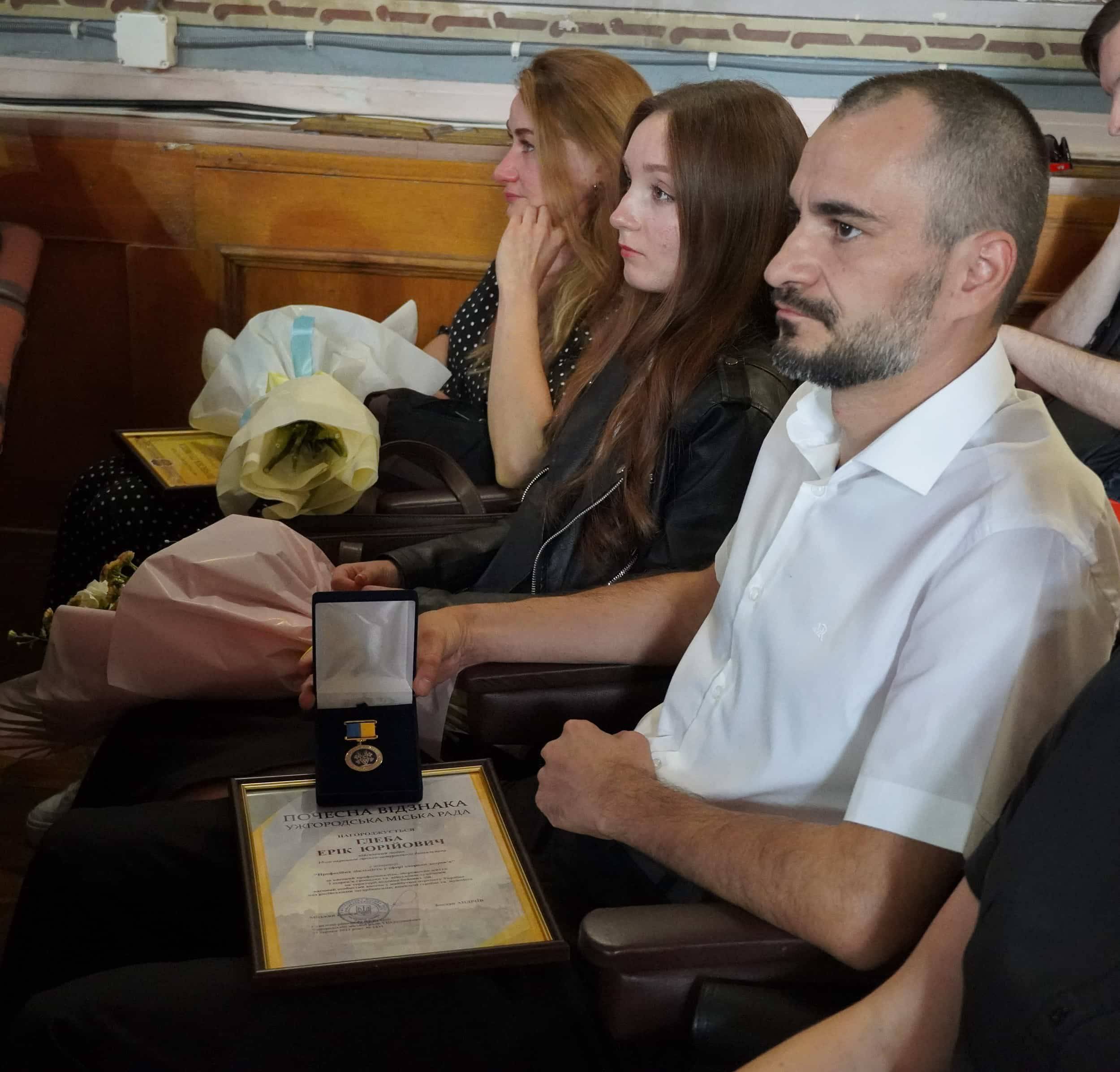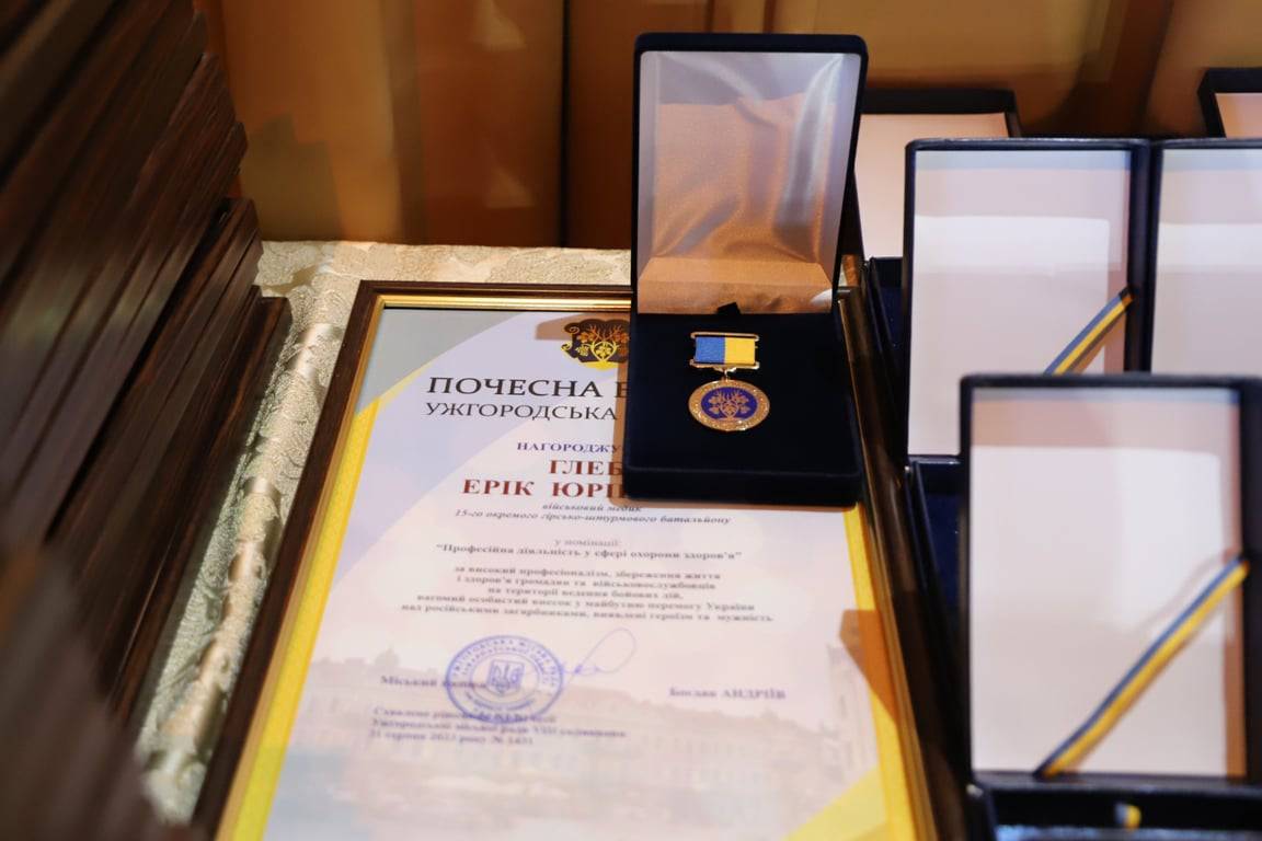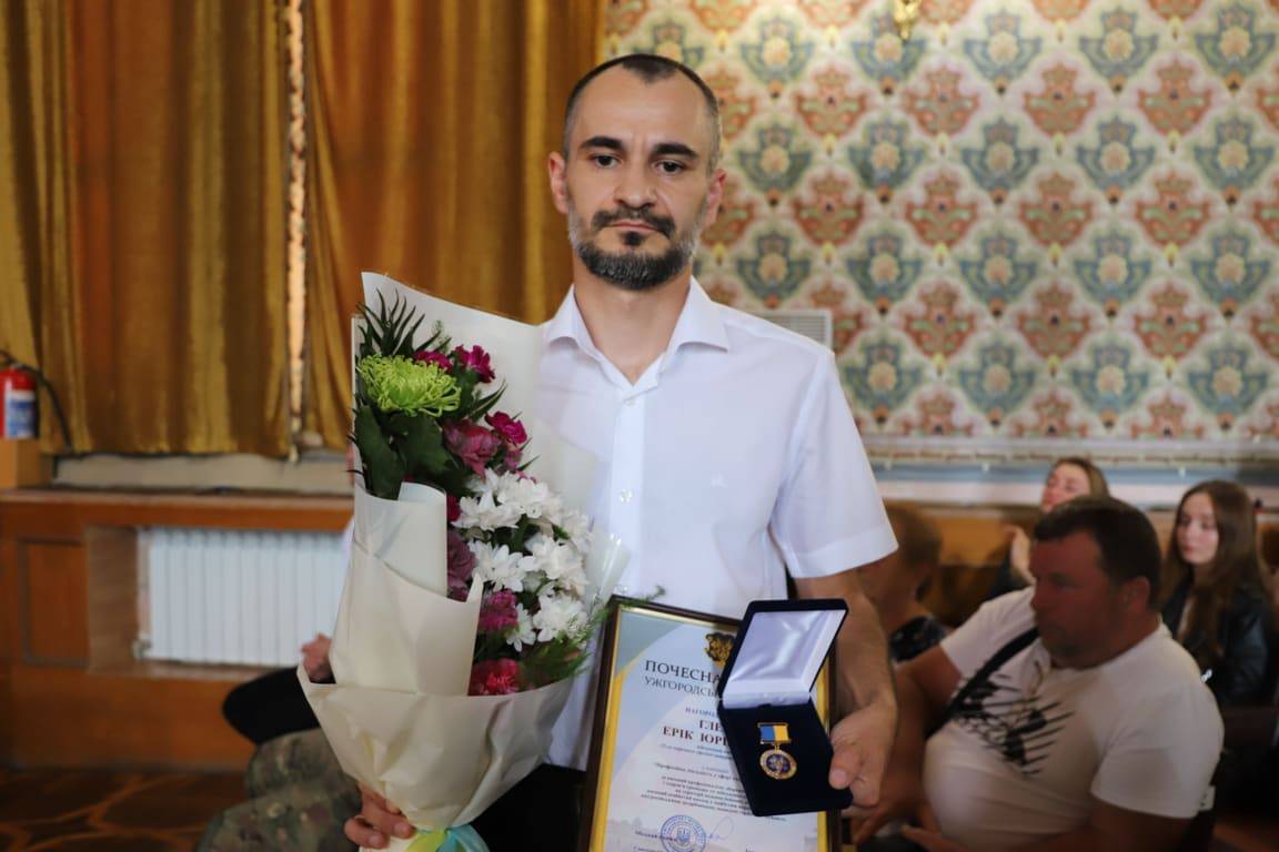 За високий професіоналізм, збереження життя і здоров’я громадян та військовослужбовців на території ведення бойових дій, за вагомий особистий внесок у майбутню перемогу України над російськими загарбниками, проявлений героїзм та мужність Почесною відзнакою Ужгородської міської ради у номінації «Професійна діяльність у сфері охорони здоров’я» нагородили Еріка Глебу – військового медика 15-го окремого гірсько-штурмового батальйону. На загальноміському Віче нагороду йому