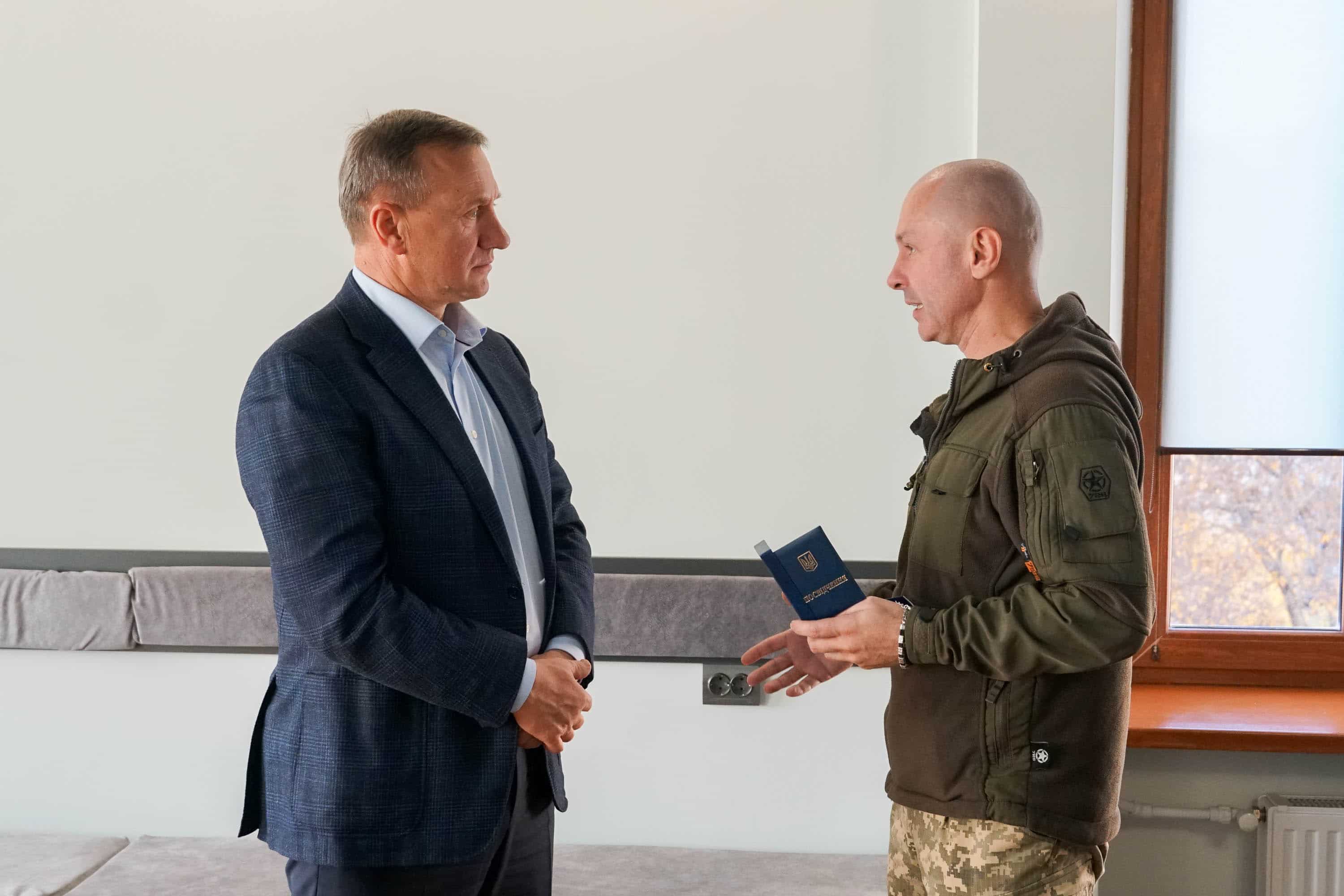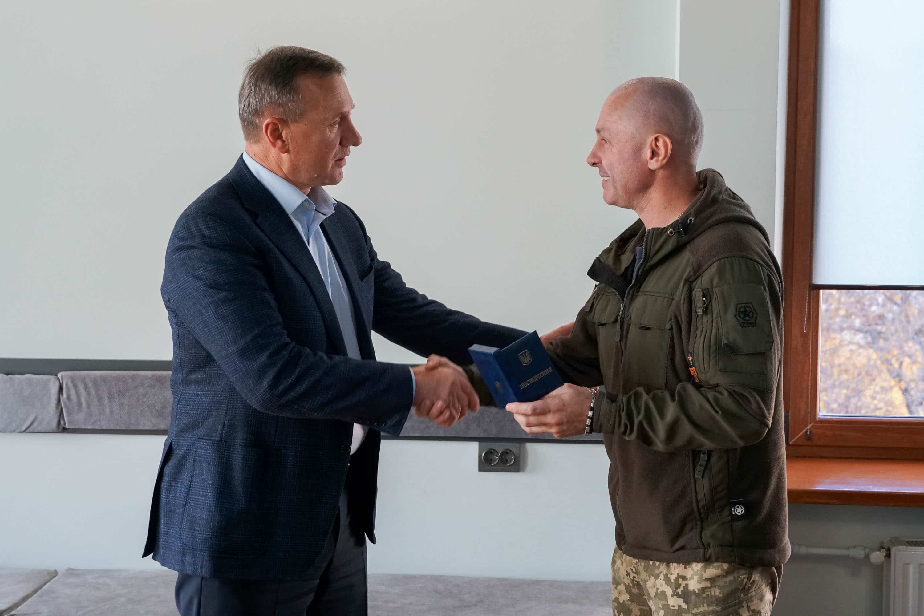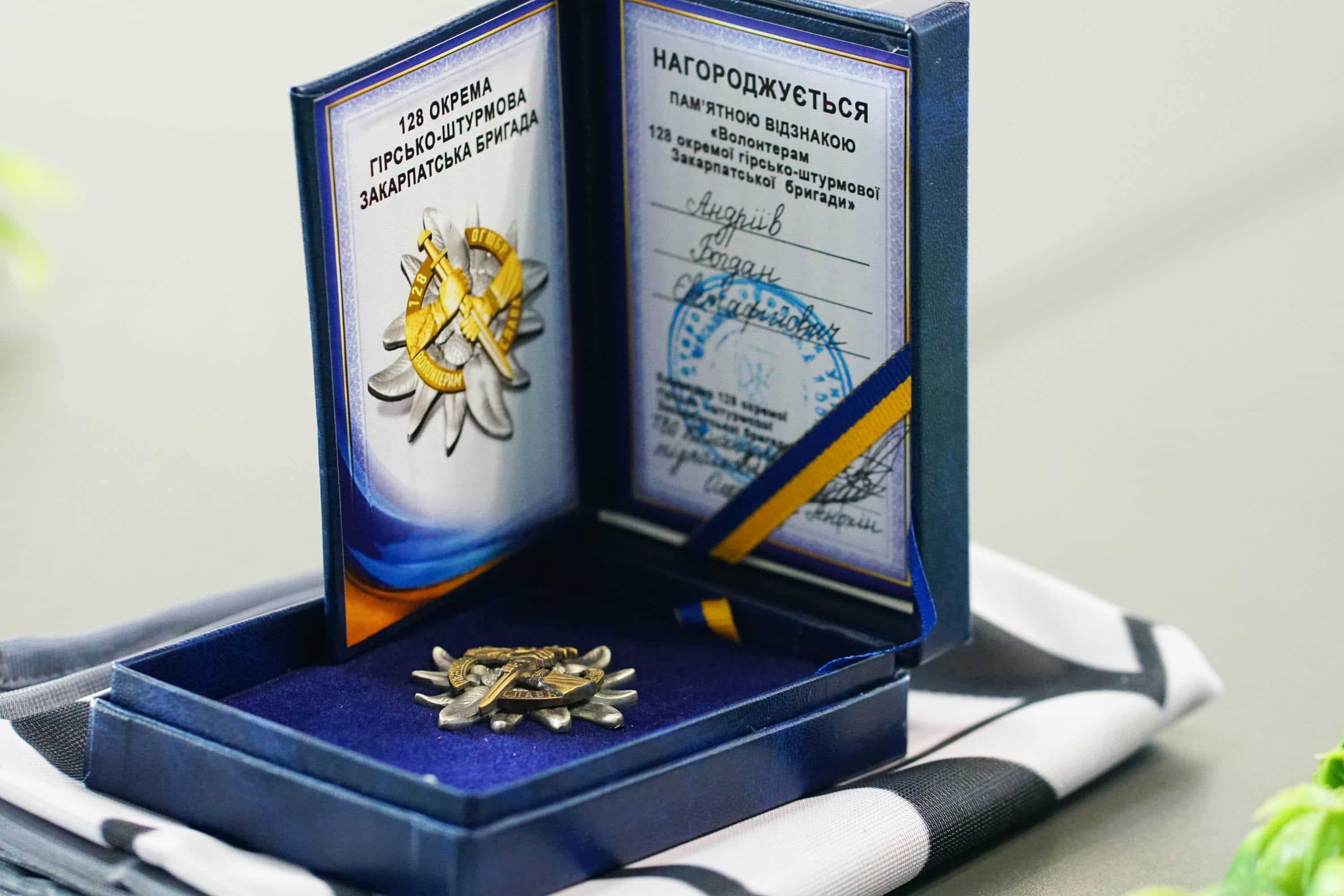 Тимчасово виконуючий обов’язки командира бригади, підполковник Олександр Анохін вручив міському голові Богдану Андріїву пам’ятну відзнаку «Волонтерам 128-ї окремої гірсько-штурмової бригади» – як знак вдячності громаді Ужгорода за постійну допомогу, турботу про військових та підтримку підрозділу.