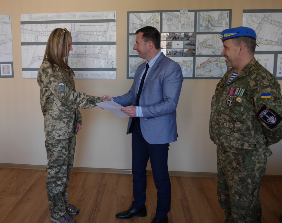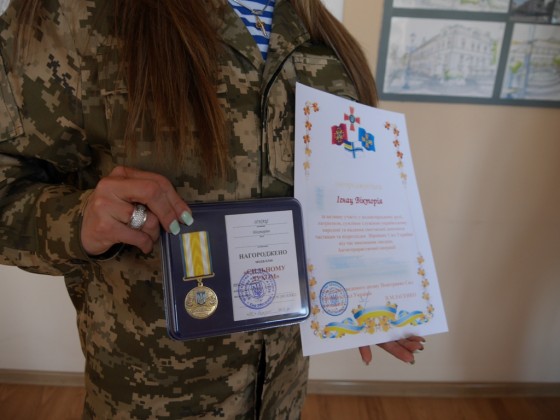 Таку ж відзнаку вручено й волонтерці Вікторії Ігнац, яка щойно повернулася зі Сходу – уродженці Тернопільщини, котра зараз проживає у Будапешті та допомагає пораненим бійцям, які приїжджають до Угорщини на лікування, крім того, опікується нашими військовими у столичних лікарнях та систематично виїжджає з допомогою на передову.