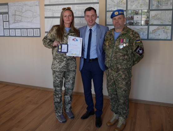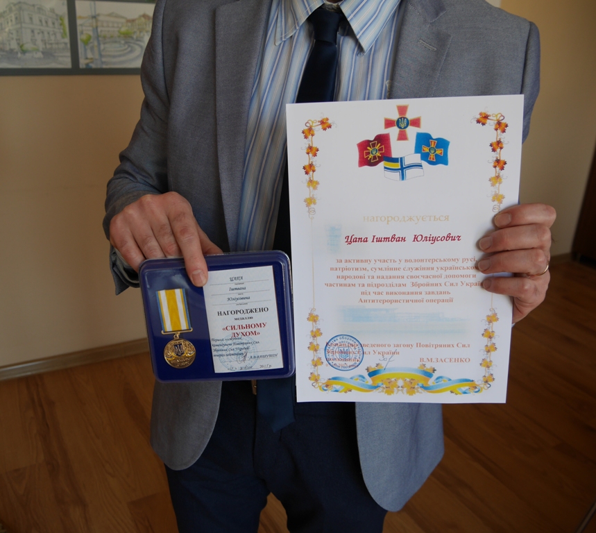 Високу нагороду – медаль «Сильному духом» за активну волонтерську діяльність з рук ужгородського кіборга, голови ГО «Побратими України» у Закарпатській області Миколи Миня отримав сьогодні перший заступник міського голови Іштван Цап.