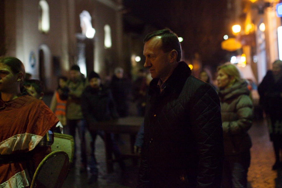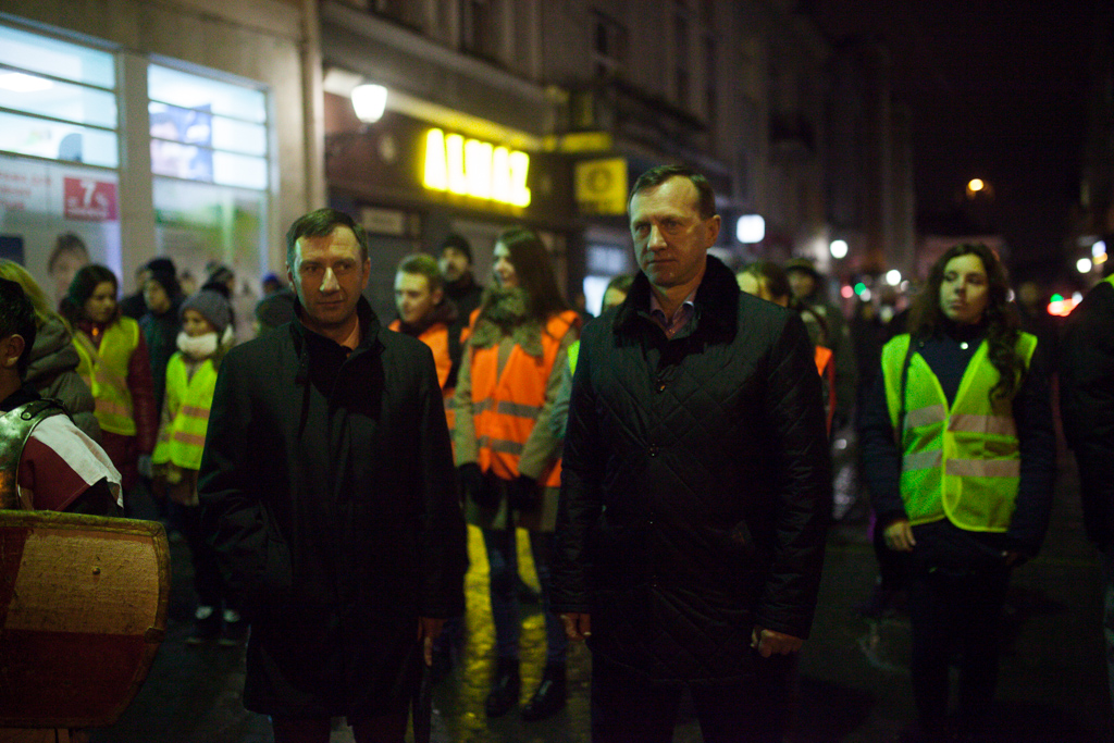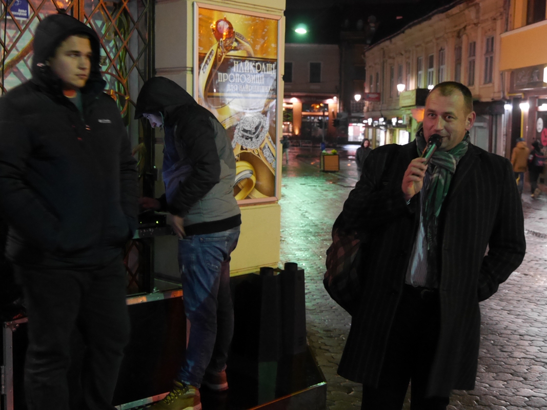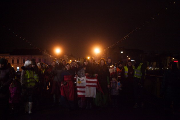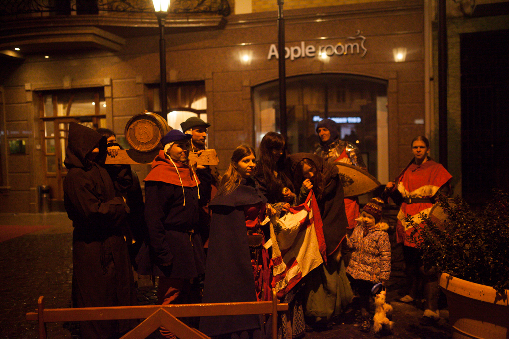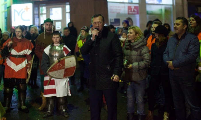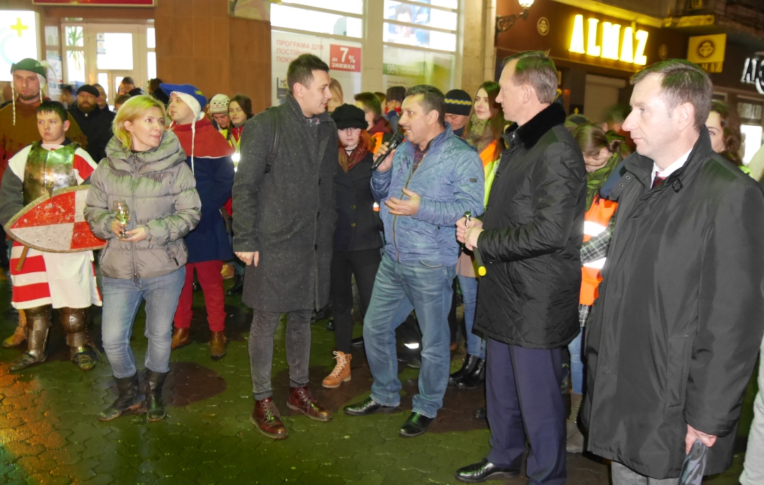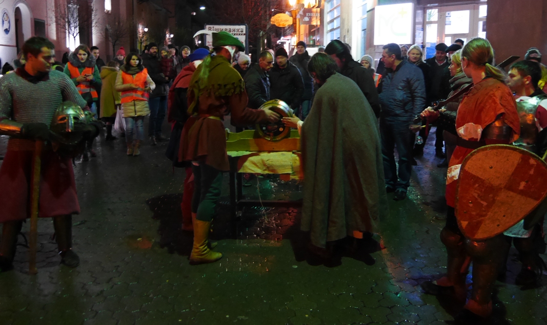 Розпочалося святкове дійство сьогодні на площі Шандора Петефі в Ужгороді ходою з лицарями Ордену Святого Миколая та прекрасними дамами, яка через пішохідний міст і площу Театральну рушила на Корзо.