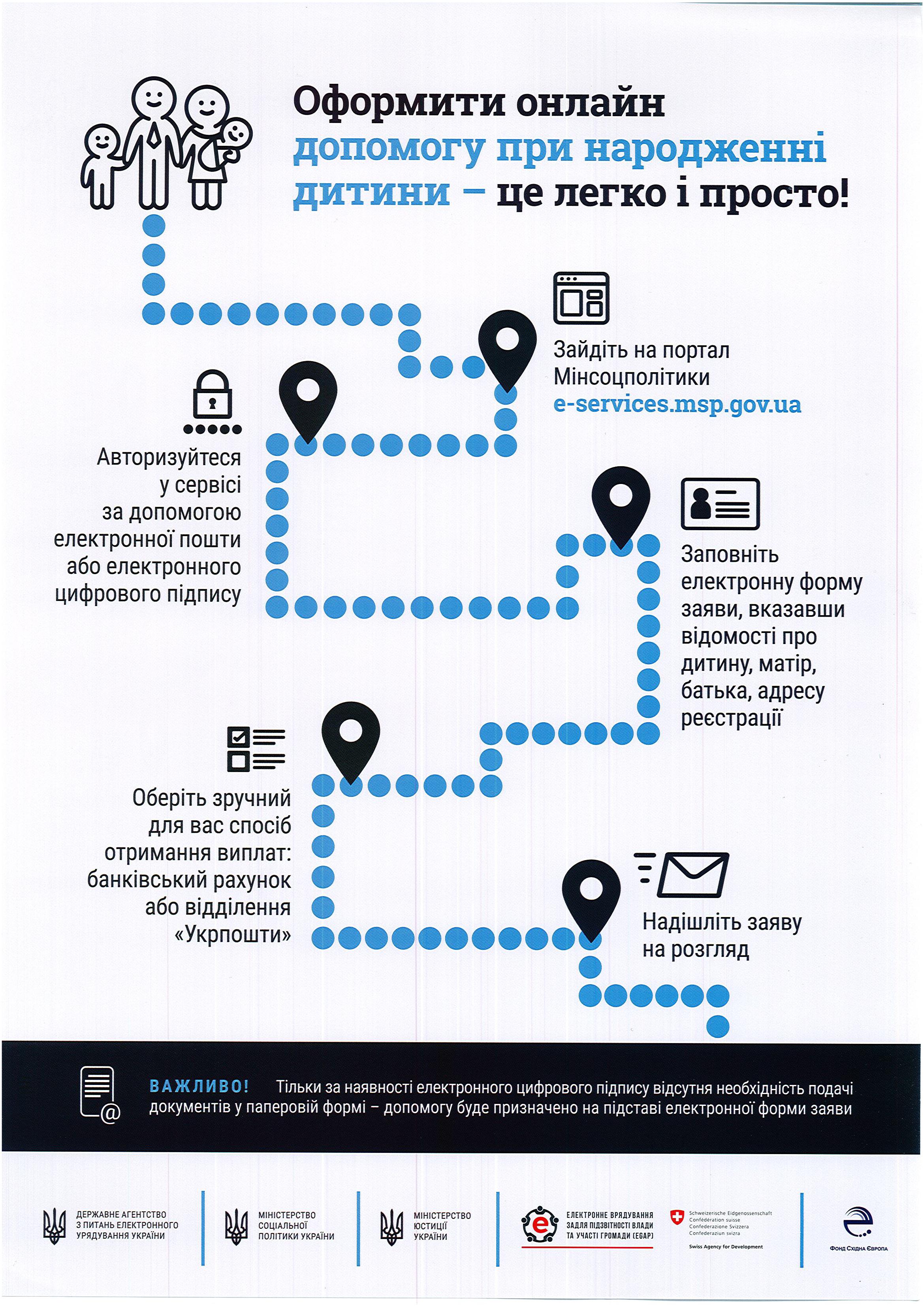 Із березня цього року в Україні почав діяти сервіс, який дозволяє оформляти допомогу на новонародженого через Інтернет. Електронна послуга доступна на сайті Мінсоцполітики.